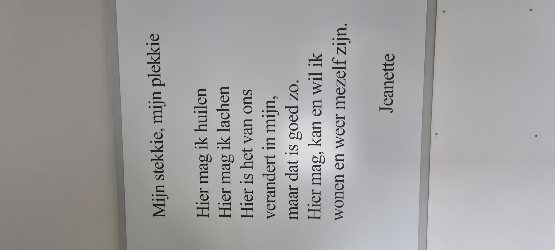 In een unieke samenwerking tussen Woonstede, Malkander, Cultura, bewoners van de flat Groot Derxsgoed in Hoogbouw Ede-Zuid en de voormalige stadsdichter van Ede (Larissa Verhoeff) zijn prachtige gedichten ontstaan. Deze gedichten, die de eigenheid van iedere bewoner weerspiegelen, sieren nu de muren van het trappenhuis op elke verdieping van het gebouw Groot Derxsgoed.