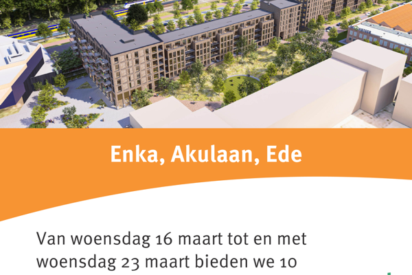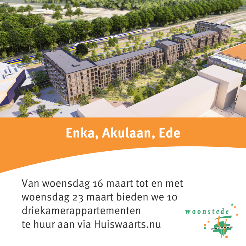 We zijn gestart met de verhuur van de 201 nieuwbouw twee- en driekamer huurappartementen Enka, aan de Akulaan in Ede. De eerste appartementen zijn al verhuurd. Tot en met 23 maart 2022 bieden we de volgende 10 driekamerappartementen voor verhuur aan. Daarna gaan we vanaf 18 mei 2022 verder met het adverteren van de volgende appartementen.