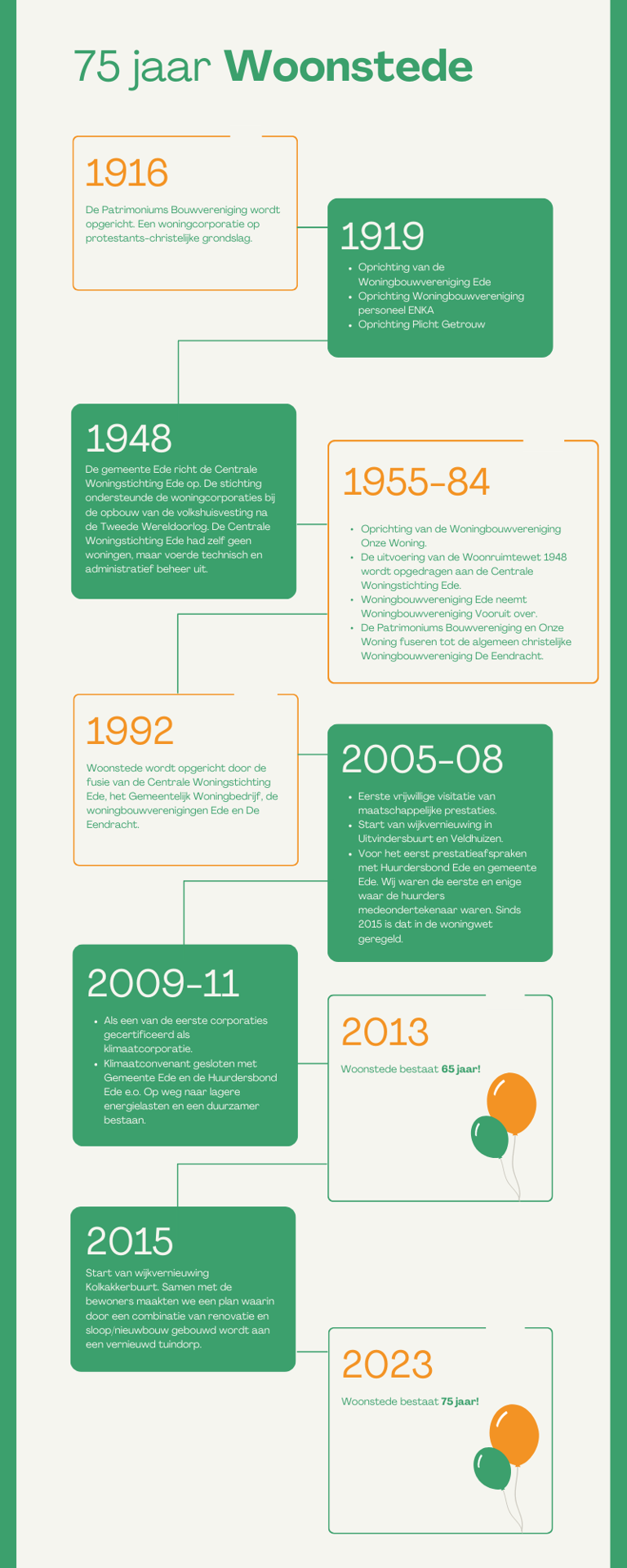 Woonstede bestaat op 29 april 75 jaar! We bouwen al 75 jaar elke dag aan een fijn thuis voor onze huurders in de gemeenten Ede en Scherpenzeel. Want een huis is pas een thuis als het een fijne plek is die bij je past en waar je je goed voelt. We vieren onze verjaardag een jaar lang samen met u: onze huurders, medewerkers en partners. Het hele jaar door organiseren wij activiteiten. Geef iemand op voor een Woonstede lintje of doe mee aan de foto- en kunstwedstrijd! Houd deze pagina in de gaten voor alle updates rondom de planning van ons feestjaar.